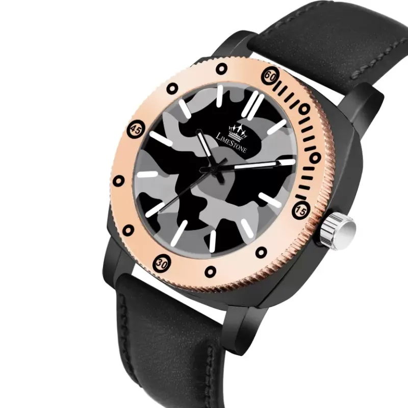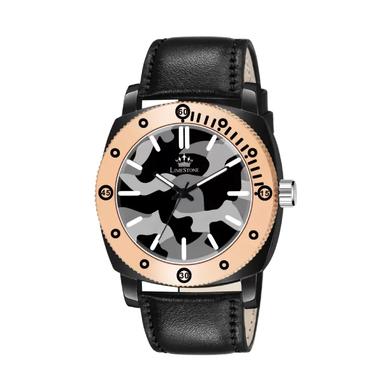 Introducing the Limestone LUXE105 Camouflage Dial Black Leather Strap Analog Watch for Men, where sophistication meets rugged style. Elevate your wrist game with this masterpiece, meticulously crafted to blend elegance with durability, ensuring you stand out in any crowd.